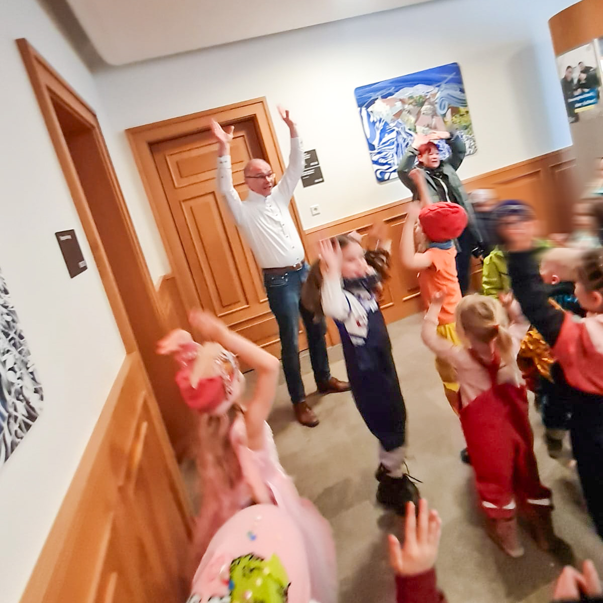 ”Wir haben oben gute Laune, unten gute Laune, vorne gute Laune, hinten gute Laune, rechts gute Laune, links gute Laune, gute Laune einfach überall.”, sangen die Kinder gemeinsam mit ihren Erzieherinnen und unser Bürgermeister machte sofort spontan, stimmgewaltig und tanzend mit.